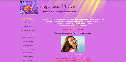 Glad you came to this Page. I've set it up for my Regular Viewers. As you can see, I run several Inspirational Websites. Collectively speaking, you can say they are an “Oasis On The Net” (©) to bring a measure of peace and comfort, inspiration, happiness, practical help and encouragement into hearts and homes, without the imposition of pesky Google Ads and notices or intrusive Email Campaigns. These are user friendly Multi-Page Websites, not cluttered or crowded with content (many websites have too much happening on them which is a sheer distraction from what you wish to read). Each of my Websites commenced with a different concept and purpose.